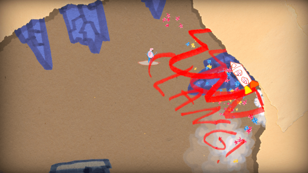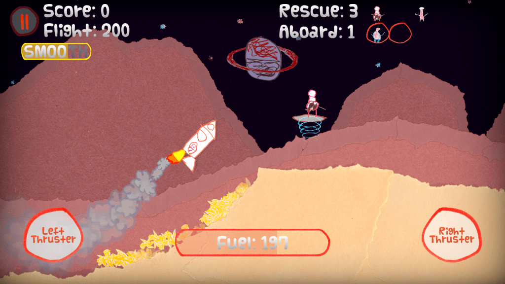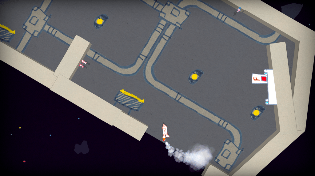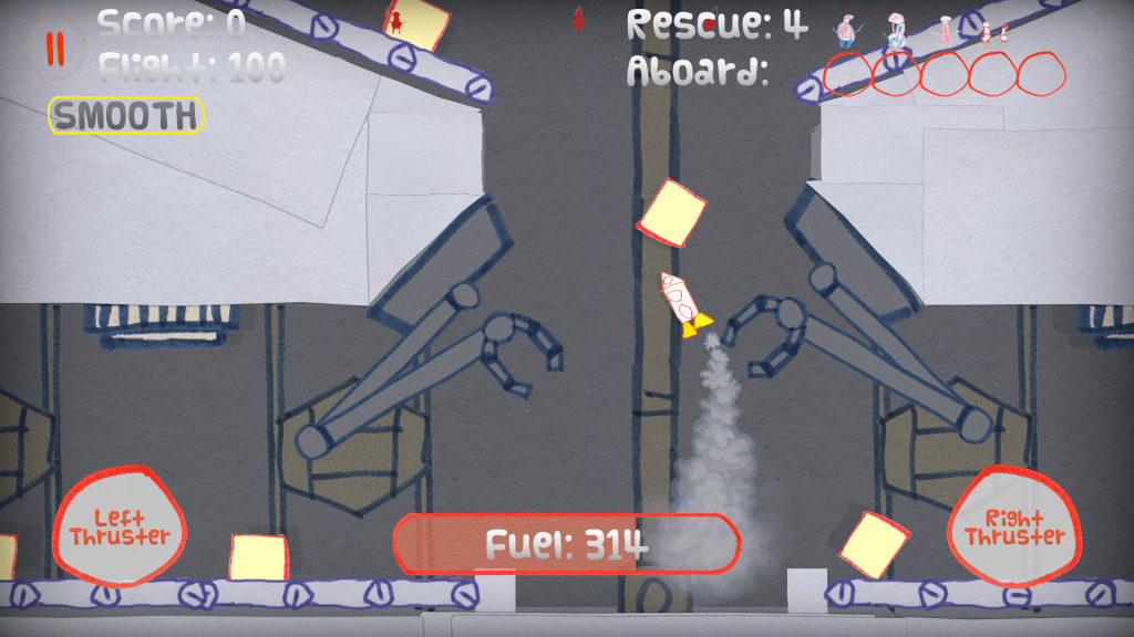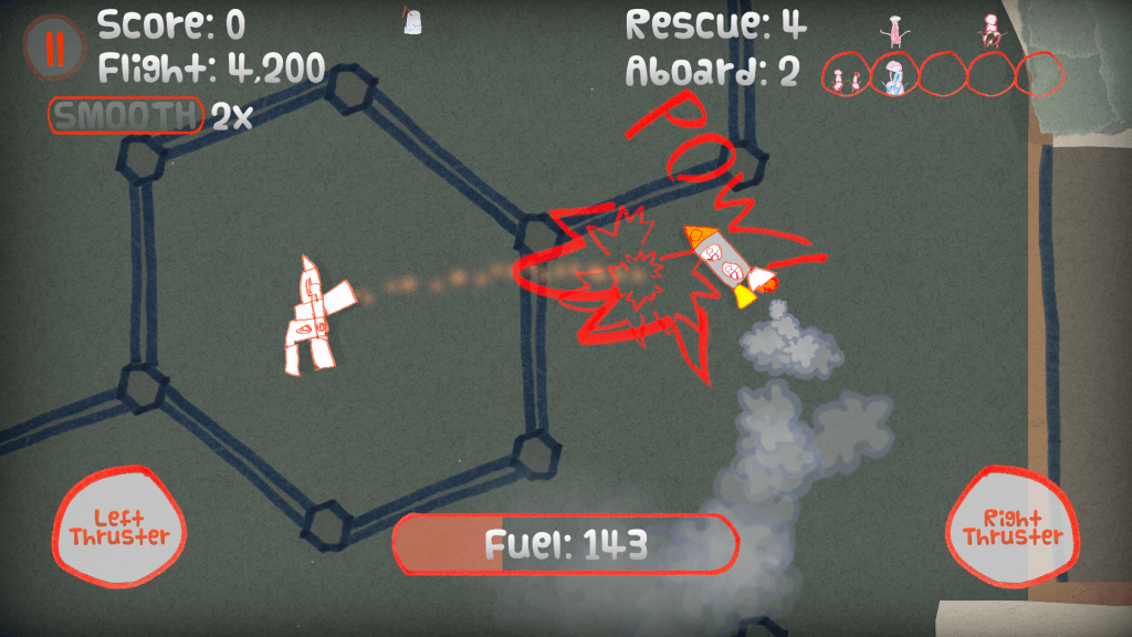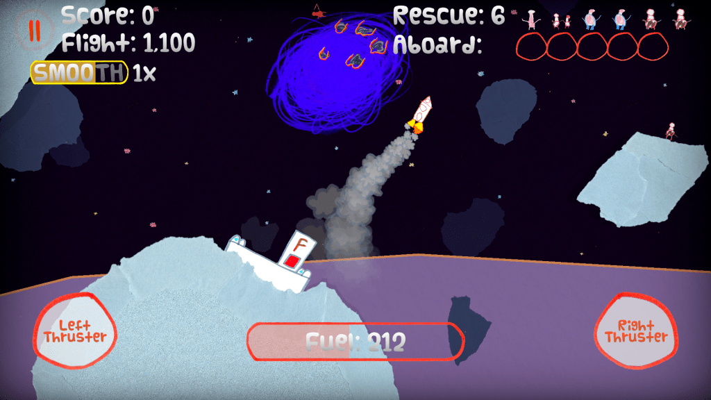 LOOSE NOZZLES is a lighthearted but deviously challenging game, projecting classic arcade gameplay through the lens of a child’s drawings. Players fly a ramshackle rocket through increasingly labyrinthine levels to rescue endangered colonists, avoiding damage that knocks parts off your ship and changing how it handles. Try to save everybody without losing your nozzles!